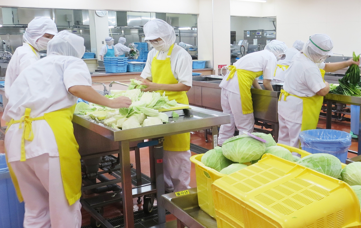 午前中は野菜などの洗浄やカット・調理・配缶、午後は使用した調理器具や返却された食器などの洗浄がメインです。